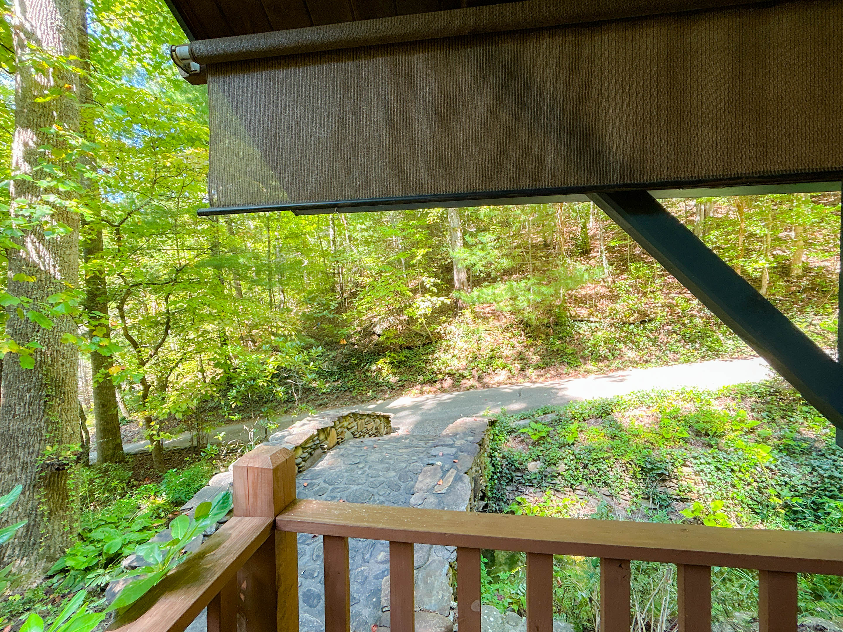 Covered deck with views of misty Smoky Mountain mornings