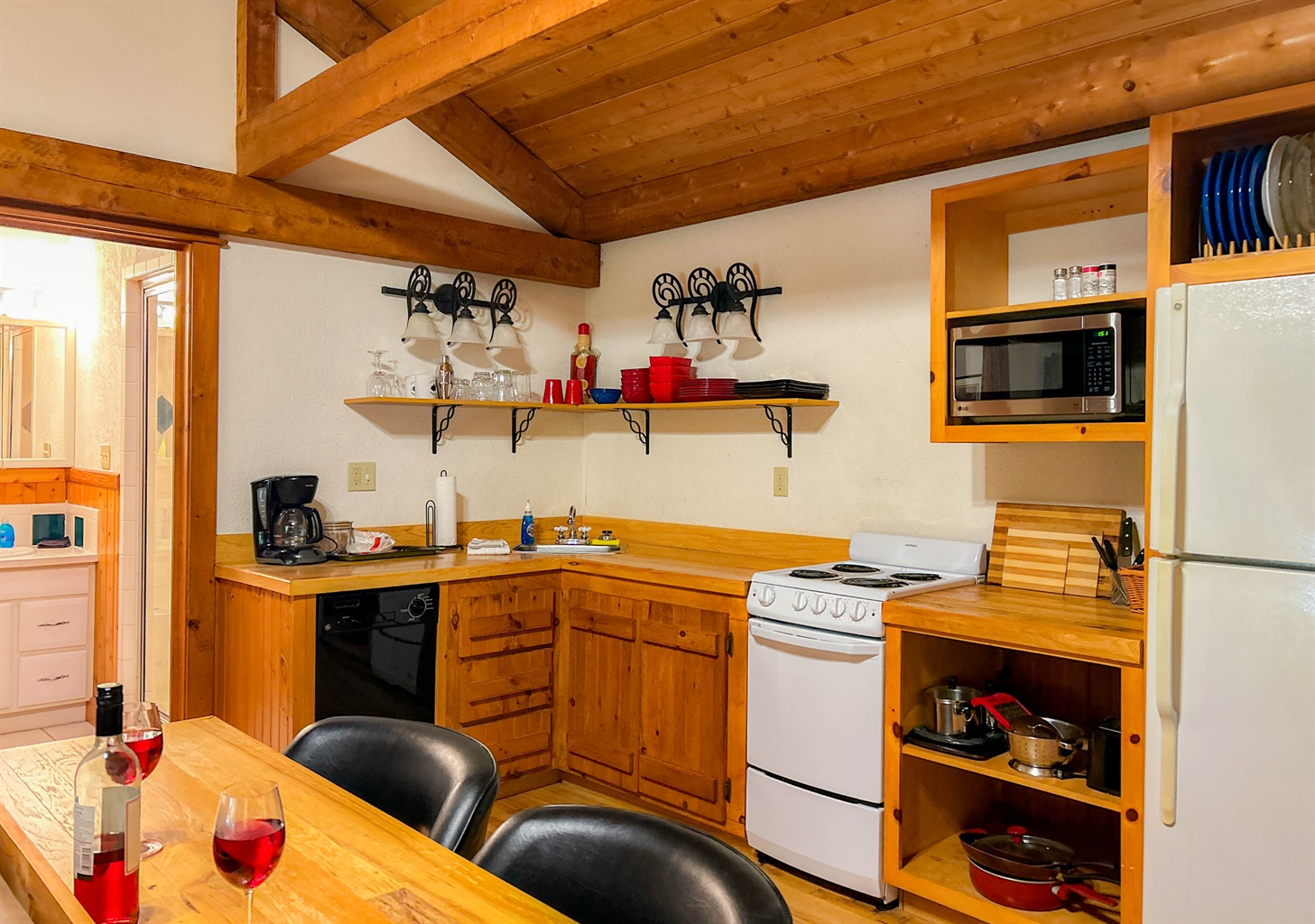 Fully equipped kitchenette with essentials, dishware, and cookware