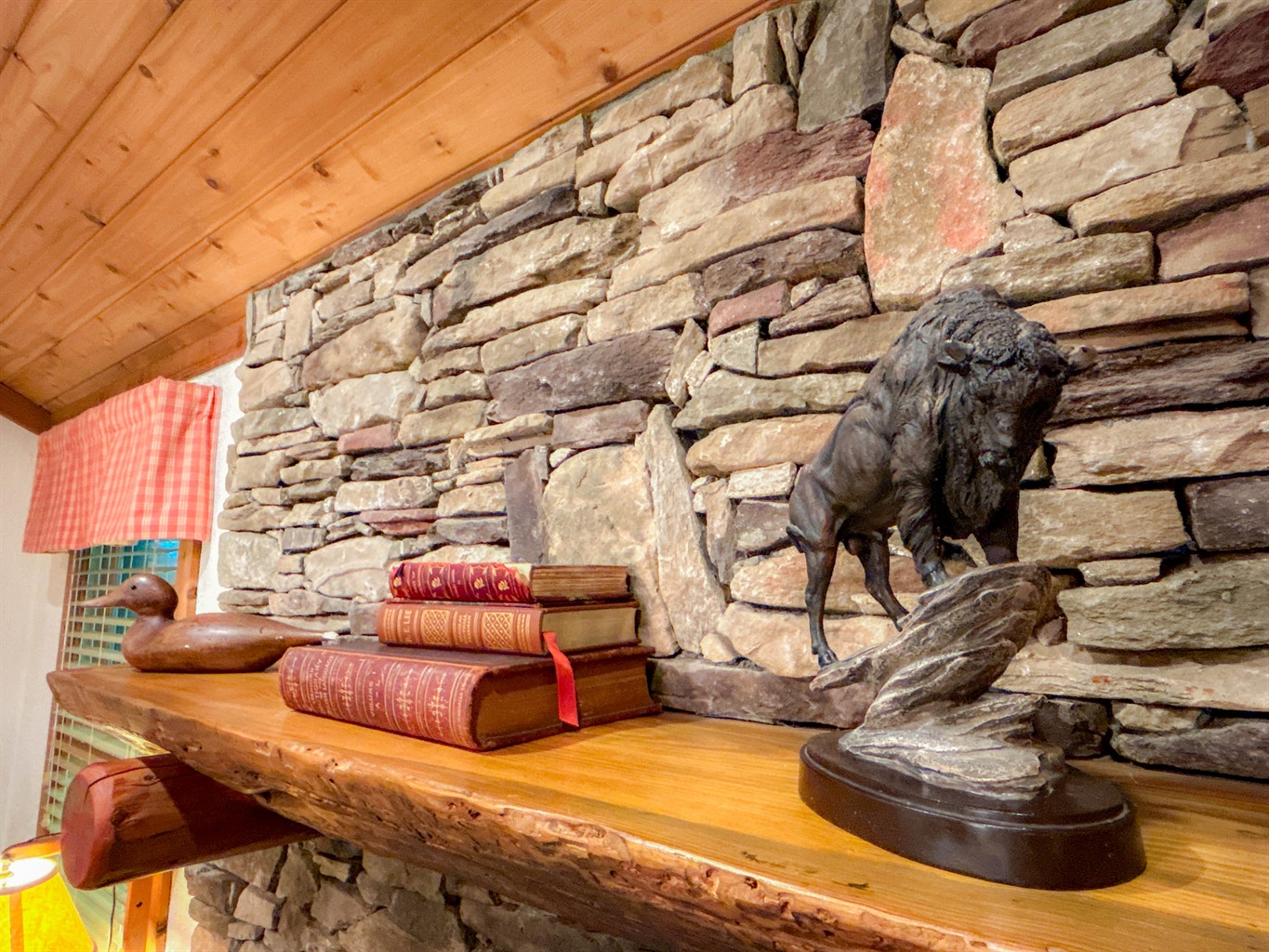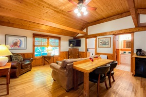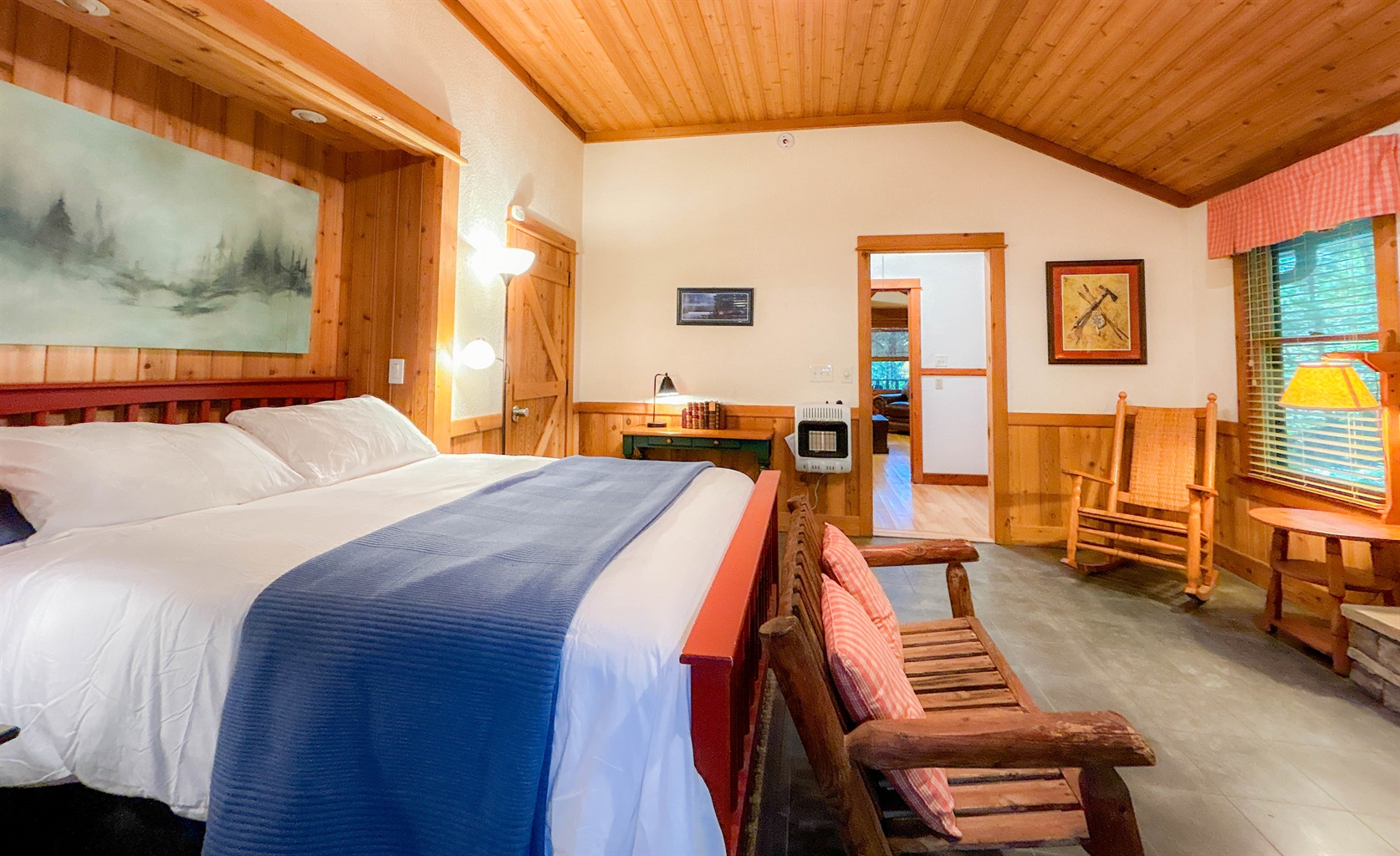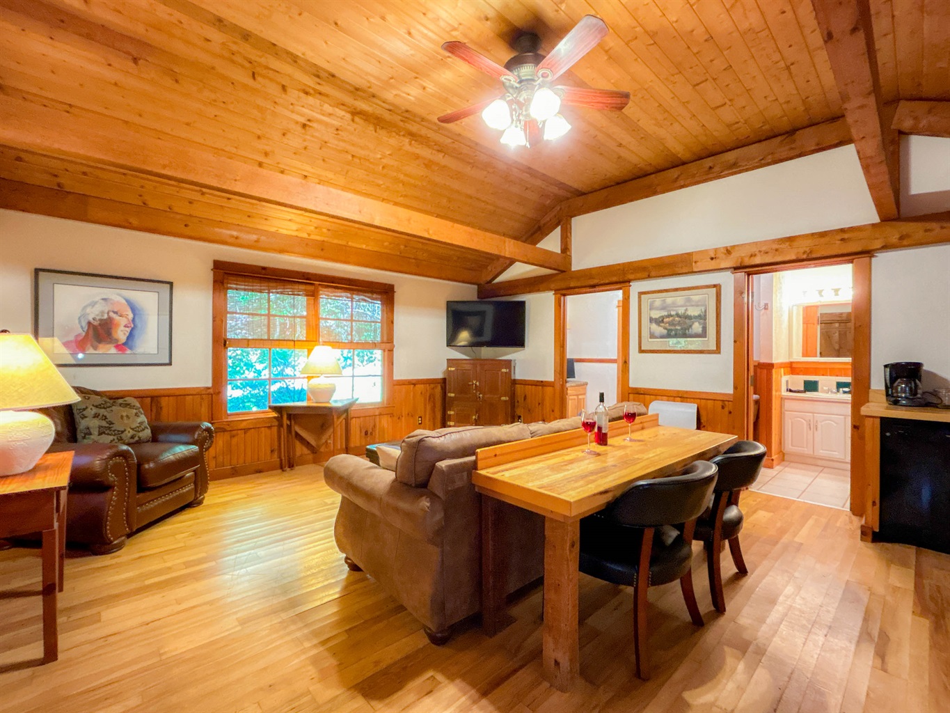 Rustic-modern interior with cedar walls, beams, and hickory floors