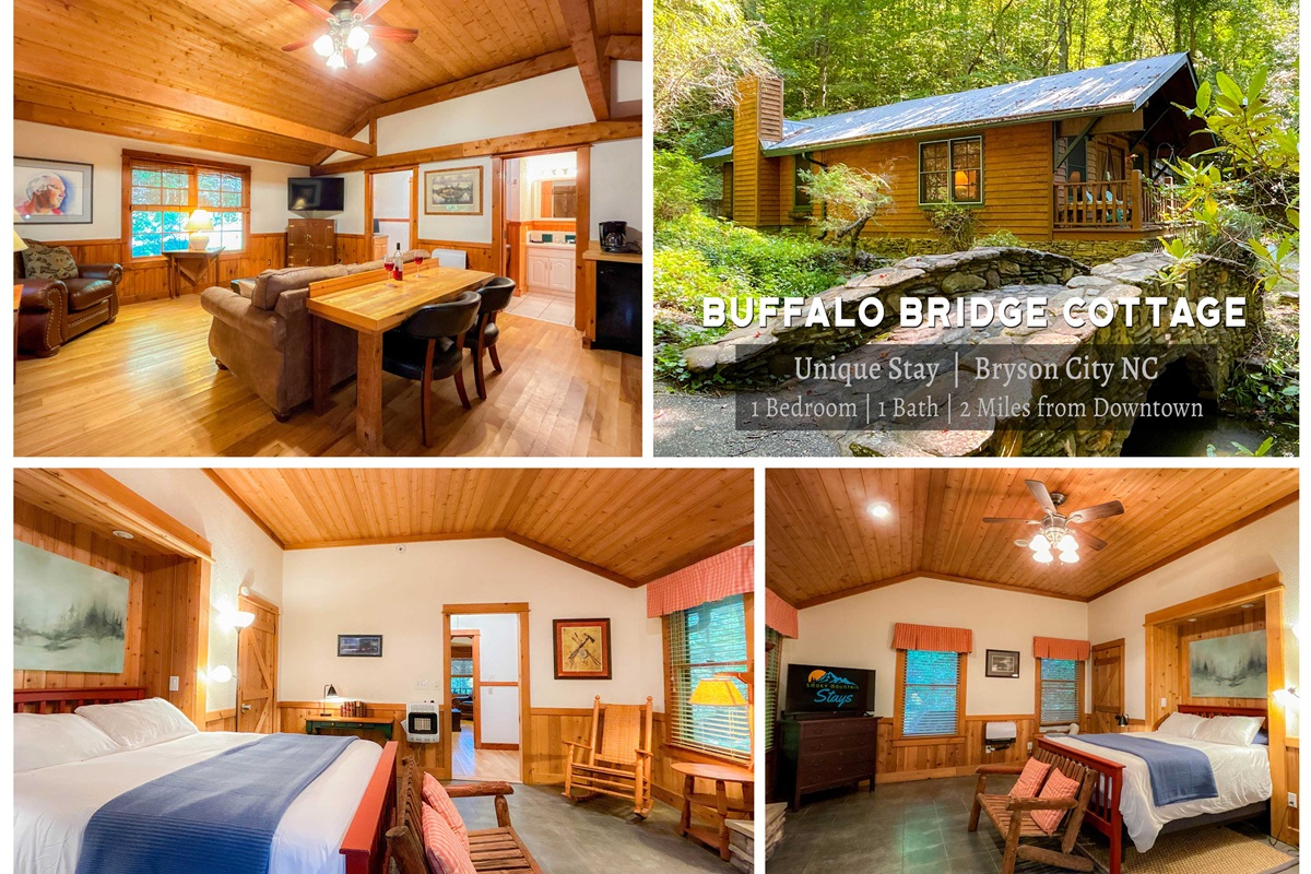 1 Bedroom • 1 Bathroom 1 Bath • Sleeps 1-2BUFFALO CREEK BRIDGE COTTAGE | Cozy Couples Retreat in the Smokies