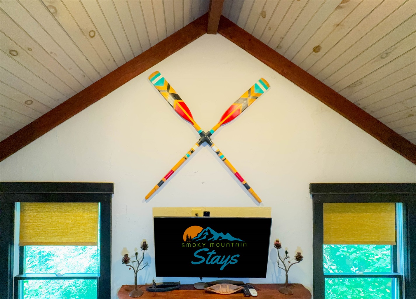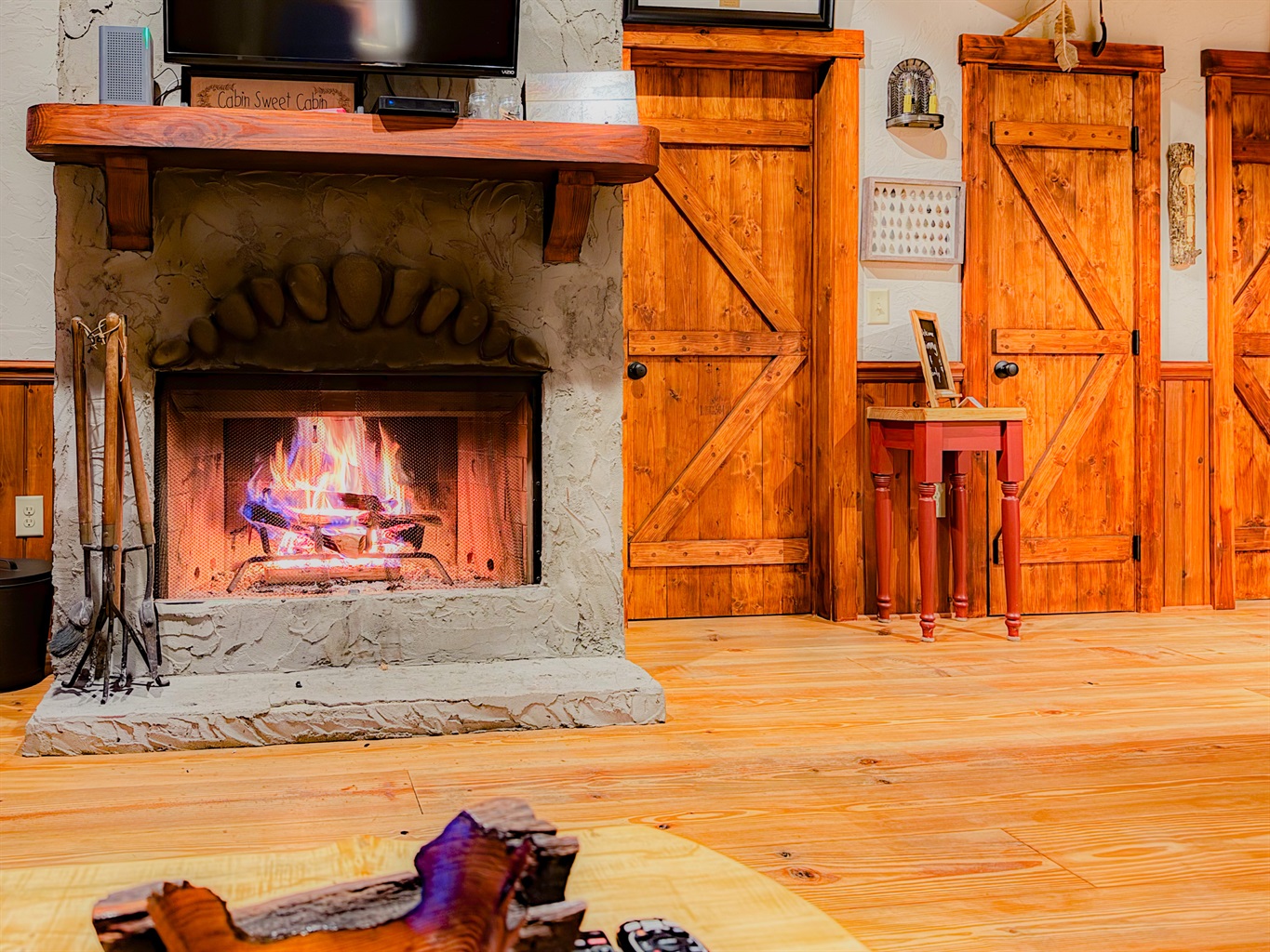 • Vaulted great room with knotty-pine walls, a plush sofa, 48" Smart TV, and wood-burning fireplace (firewood provided Oct–Mar).